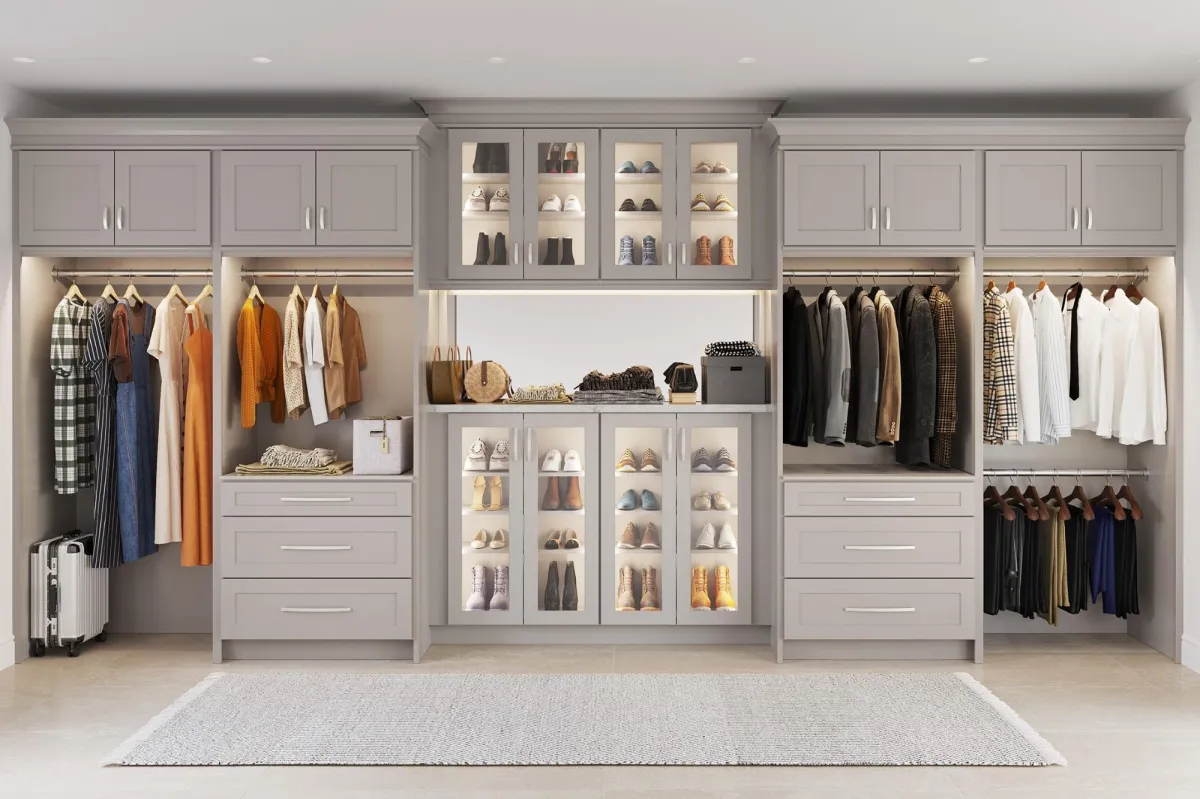 Probably one of the most overlooked spaces to add cabinets is in closets. Adding extra storage to this space is a game changer. Being able to neatly stack-and-show your shoes or pack away seasonal clothes are only a couple of benefits in this design. You’ll wonder what you never did this sooner.